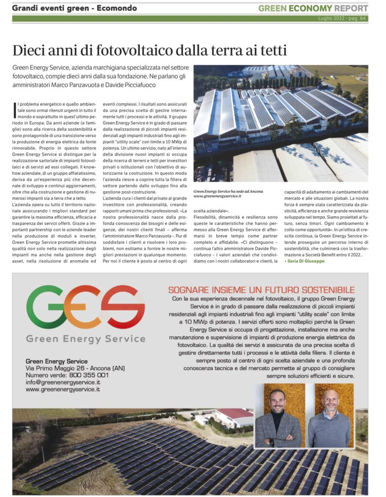 Green Energy Service compie dieci anni dalla sua fondazione. Ne parlano  gli amministratori Marco Panzavuota e Davide Picciafuoco in un articolo di Green Economy Report.